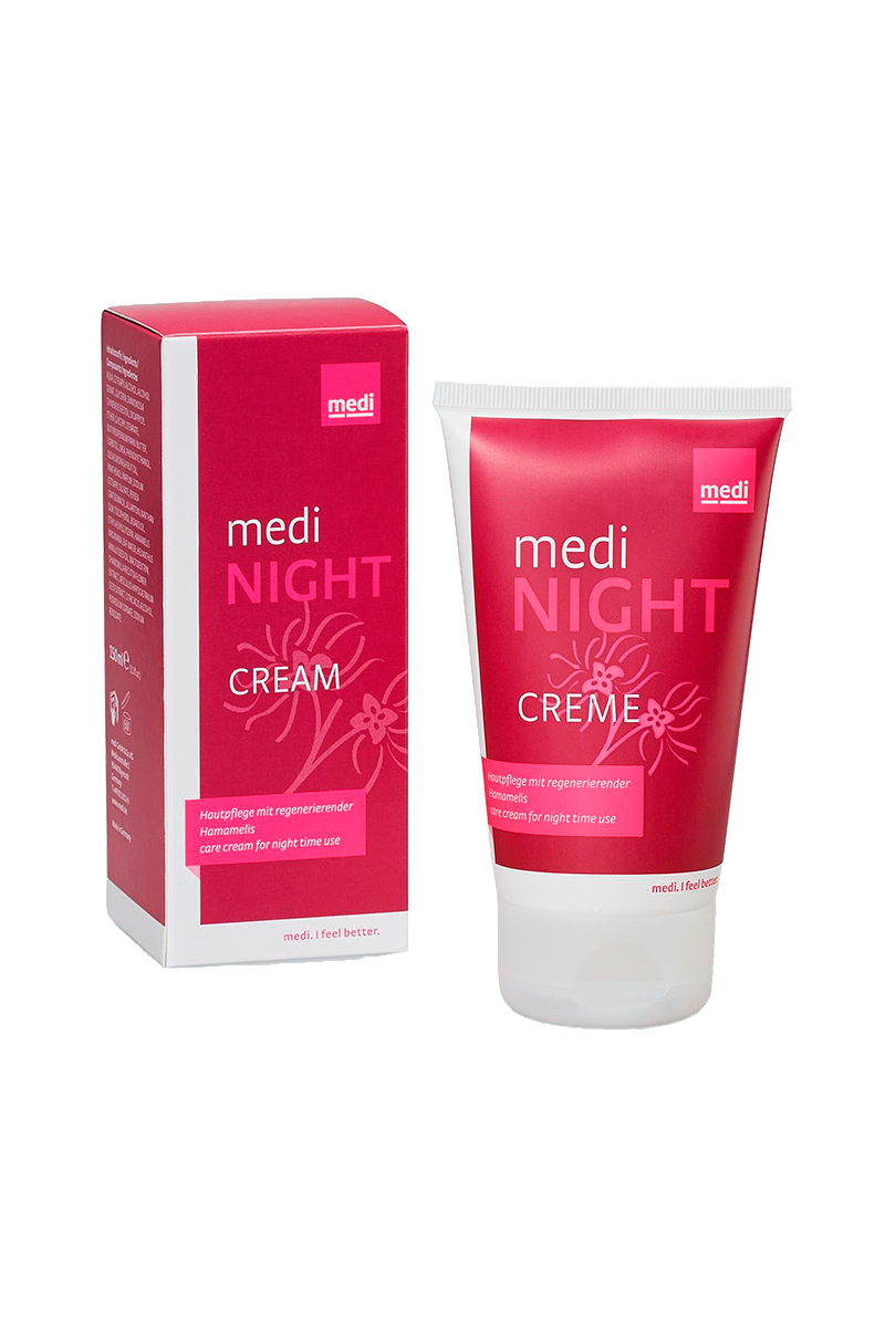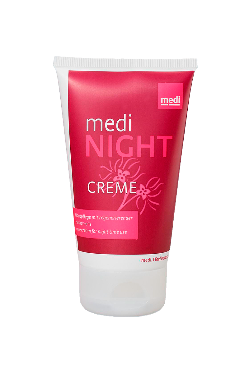 medi night — это успокаивающий крем, который помогает восстановить вашу кожу во время сна. Масло жожоба смягчает кожу ног и улучшает ее регенерацию в ночное время. После снятия компрессионных чулок нанесите, пожалуйста, medi night. Входящий в состав гамамелис успокаивает Вашу кожу и дополнительно способствует ее регенерации.